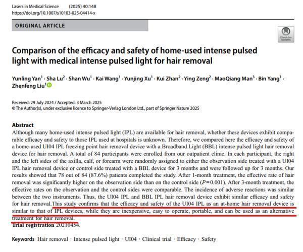 2025年5月,知名国际期刊《Lasers in Medical Science》(《激光医学杂志》)发表学术文章,论证了Ulike家用蓝宝石冰点脱毛仪的安全性和有效性。该论文由南方医科大学皮肤病医院和中山大学孙逸仙纪念医院联合发表,并收录进SCI(Science Citation Index)。至此上尚策,Ulike成为行业首个且唯一经SCI+公立三甲医院临床报告验证有效的脱毛仪品牌,不仅为光学美肤领域树立起全新的品质标杆,也为有脱毛需求的用户提供了科学可靠的脱毛新选择。