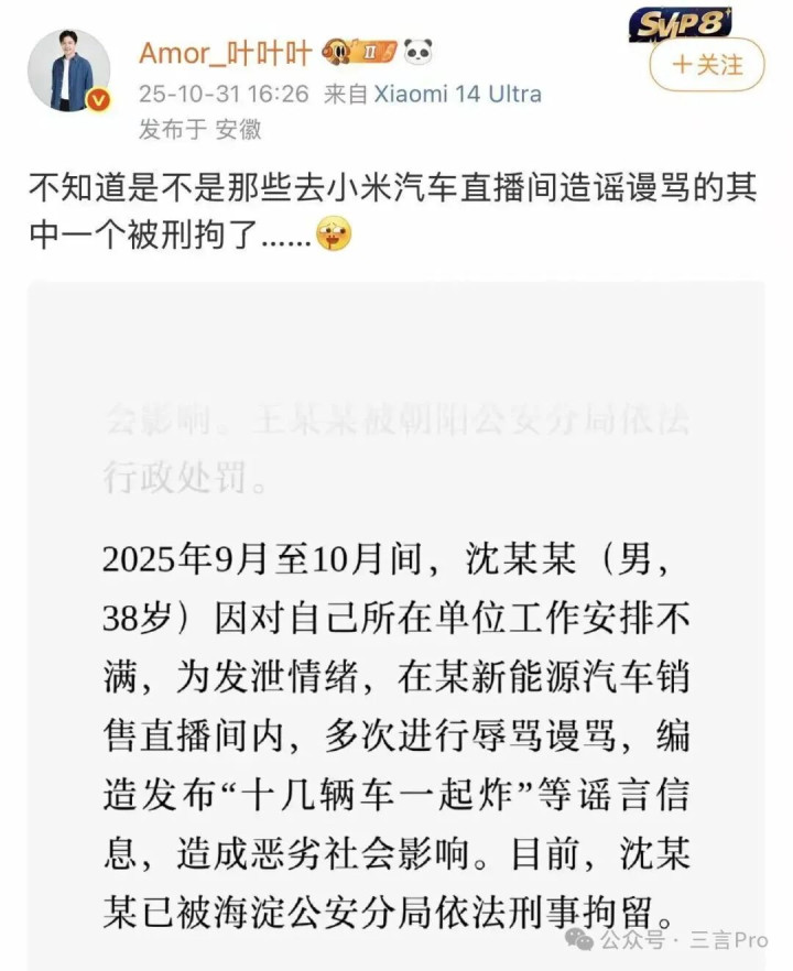 值得注意的是,其中一个案例中一38岁男子因在某新能源车企直播间内辱骂、编造谣言,被警方刑事拘留。