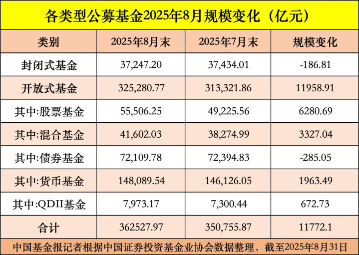 9月25日晚间,中国证券投资基金业协会发布最新一期公募基金市场数据。截至今年8月底,公募基金总规模达到36.25万亿元,单月猛增1.18万亿元。