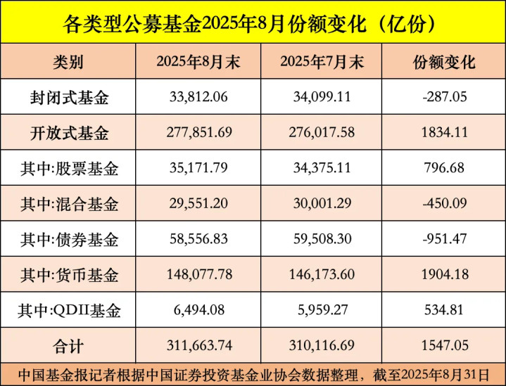 混合基金规模增长3327.04亿元,达到4.16万亿元,但8月被净赎回450.09亿份,份额降至2.96万亿份。